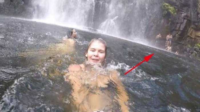 Wanita ini awalnya tidak tahu apa yang akan terjadi. Dia hanya berenang di air terjun dan asik berselfie. Sampai saat dimana para pria yang berdiri di bebatuan di belakangnya berteriak histeris. Saat itu, Anneka Brading memfilmkan dirinya sedang berenang bersama dua temannya di MacKenzie Falls.