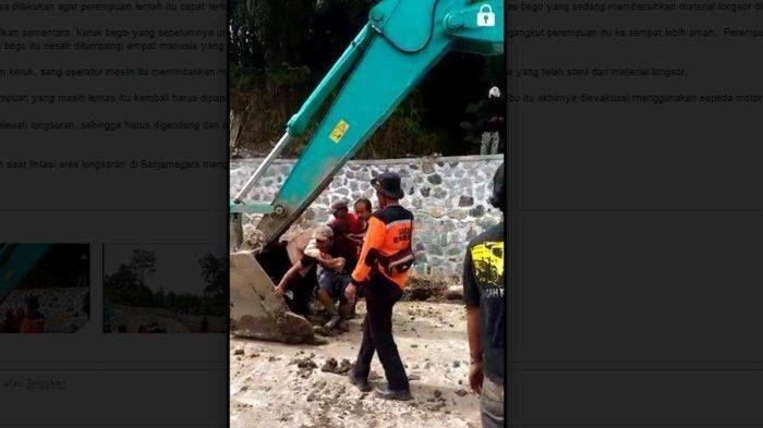 Dalam kondisi darurat demikian, apa pun bisa dilakukan agar perempuan lemah itu cepat tertolong. Ketika tenaga manusia tak cukup, sebuah excavator atau backhoe yang sedang membersihkan material longsor di tempat itu jadi robot penolong untuk guru sepuh tersebut.