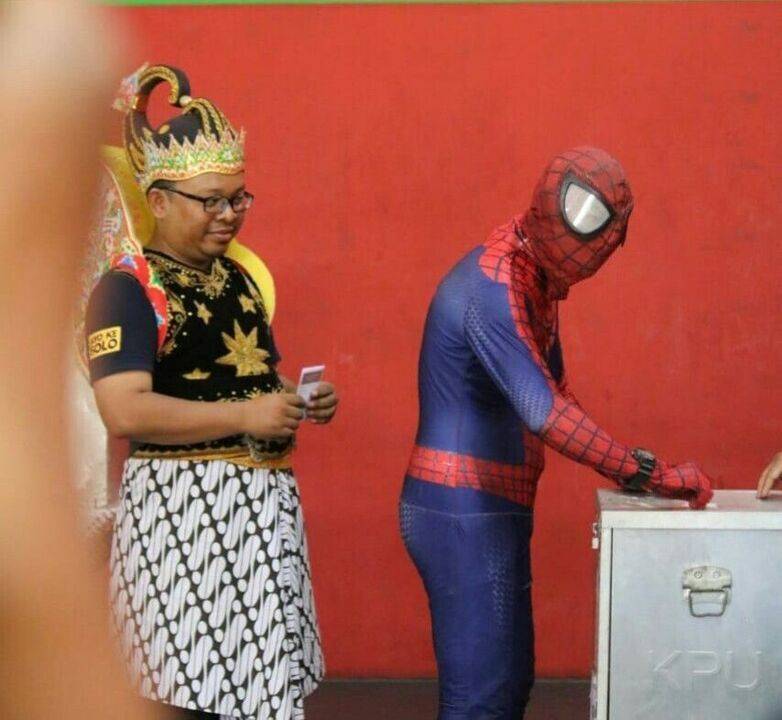 Mereka datang berjalan kaki menuju TPS 1 Gayam. Sampai di lokasi para superhero memberikan suaranya alias ikut nyoblos.