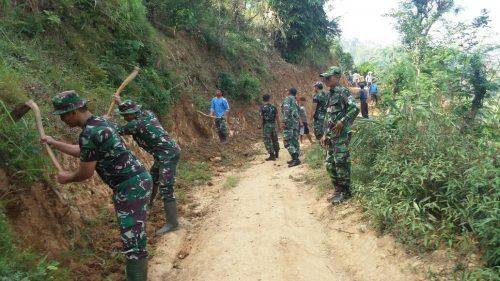 Bukan hanya warga setempat, personil Kodim 0728 Wonogiri ikut terjun langsung dalam pengerjaan pembersihan jalan sekaligus membuka badan jalan tersebut. Kegiatan itu merupakan rangkaian Pra TNI Manunggal Membangun Desa (TMMD), untuk menyukseskan TMMD Reguler ke-102 TA 2018, yang berlokasi di Desa Sukoharjo, Kecamatan Tirtomoyo.