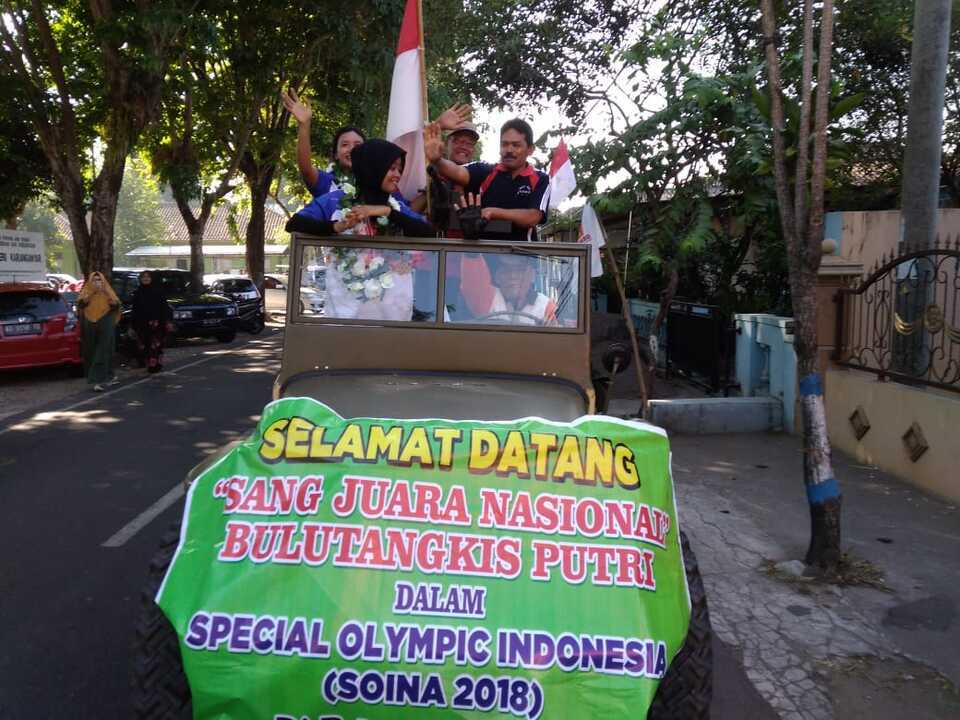 KARANGANYAR- Juara nasional bulu tangkis putri dalam ajang Special Olympic Indonesia (SOIna) tahun 2018 yang berlangsung di Riau, 19 Juli sampai 23 Juli 2018, Lena Kartika Sari, diarak keliling kota, Jumat (27/07/2018). Atlit tuna grahita yang mewakili Jawa Tengah tersebut, berhasil meraih tiga medali emas.
