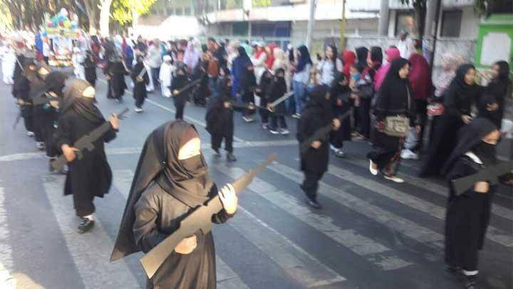 PROBOLINGGO – Sejumlah anak dari TK Kartika V Probolinggo mengikuti Pawai Budaya PAUD dan TK di Kota Probolinggo, Sabtu(18/8/2018). Aksi kontingen TK Kartika V tersebut kemudian menjadi viral karena atribut yang mereka pakai. Belasan anak tersebut mengenakan kostum hijab dan cadar hitam, serta membawa replika senjata dan pedang.