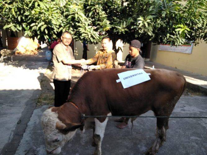 Sementara itu Rektor yang diwakili Wakil Rektor Bidang 3, Dr. Sutoyo, MPd, dalam sambutannya memaparkan qurban merupakan bentuk kepedulian civitas akademika Unisri terhadap masyarakat sekitar kampus.