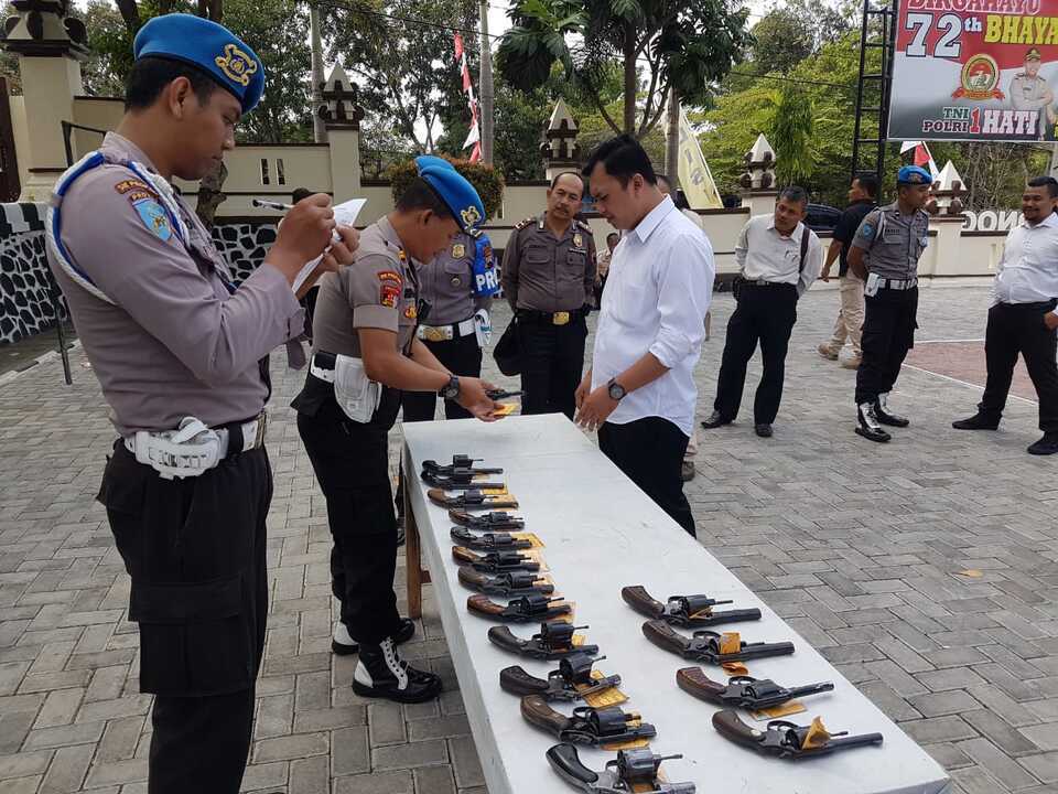 “Yang bisa dihadirkan sebanyak 32 pucuk, tidak hadir 11 pucuk. Karena ada yang dititipkan di gudang 3 pucuk, ditarik karena surat izin mati 5 pucuk, dan sisanya lagi masih dipegang untuk keperluan dinas,” jelas dia. Aris Arianto