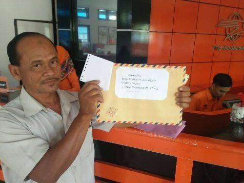 Surat pribadi itu dikirimkan Samiyo melalui Kantor Pos Sragen, Selasa (18/9/2018). Surat yang dimasukkan dalam stopmap coklat itu ditujukan dengan alamat untuk Presiden Jokowi di Istana Negara jalan Kebon Sirih No. 14, RT 11/2.