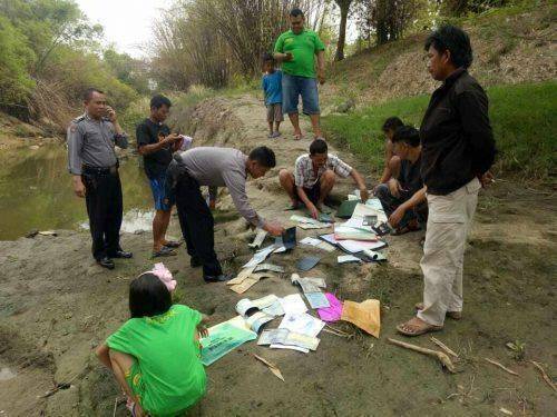 SRAGEN- Puluhan sertifikat tanah dan Buku Pemilik Kendaraan Bermotor (BPKB) ditemukan tercecer di tepi sungai di bawah Jembatan Mahbang, Kenatan, Sambungmacan, Sragen, Minggu (18/11/2018) pagi. Puluhan surat berharga itu ditemukan tanpa sengaja oleh warga yang sedang mencari ikan di lokasi kejadian.