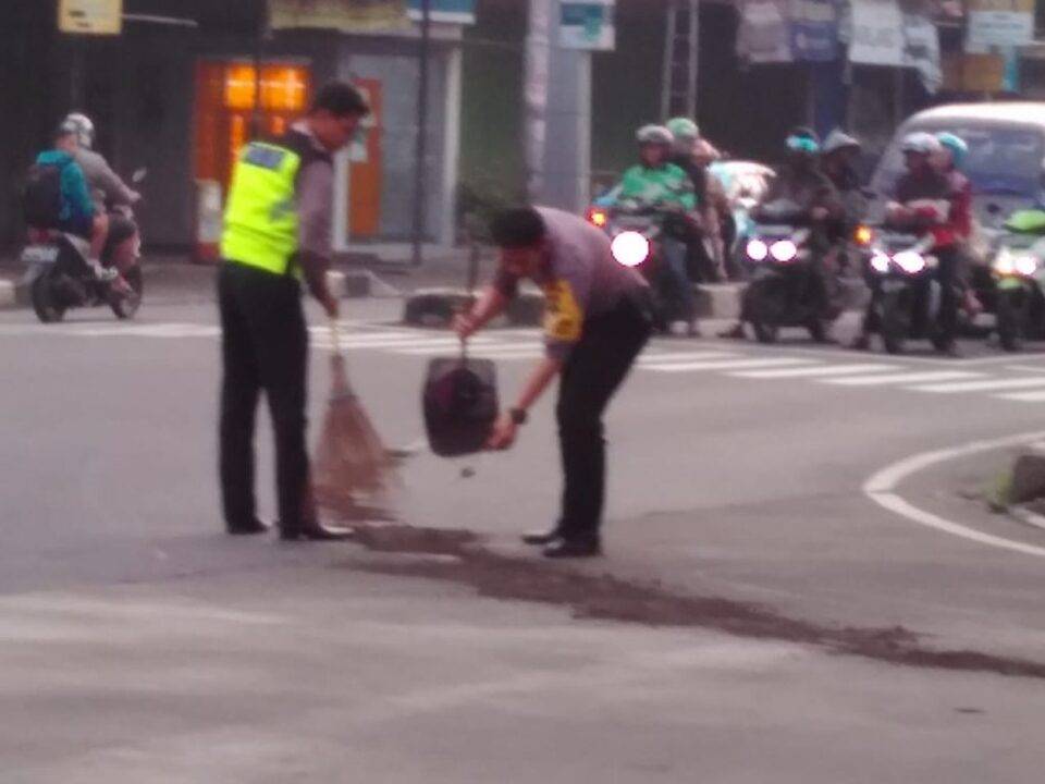 Melihat hal itu, salah personel Polsek Colomadu yang melaksanakan tugas malam hari Brigadir Iskhaq dibantu anggota Satuan Lalu Lintas Brigadir Yudha dengan sigap langsung membersihkan tumpahan tersebut menutupinya dengan pasir kemudian menyapunya.