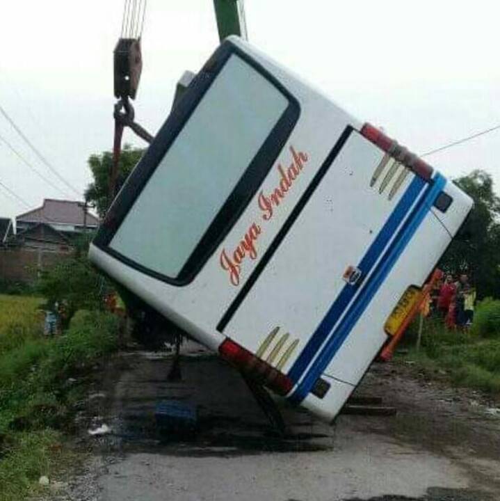 KARANGANYAR, JOGLOSEMARNEWS. COM- Kecelakaan menimpa Bus pariwisata “Jaya Indah” yang dicarter olehrombongan arisan di jalan Grompol-Jambangan, Kebakkramat, Karanganyar, Minggu (24/3/2019). Bus bermuatan puluhan orang itu mendadak terguling dan tergelincir masuk ke sawah.