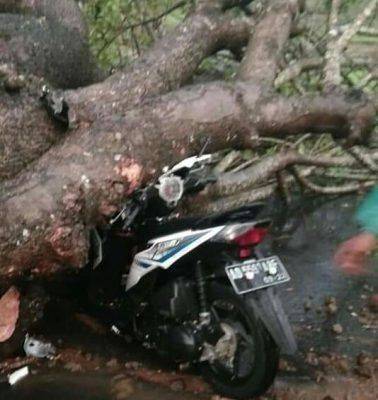 Nahas sesampai di lokasi kejadian, keduanya tertimpa pohon besar berukuran diameter 30 sentimeter di tepi jalan yang tumbang. Pohon tumbang mengenai motor dan korban.