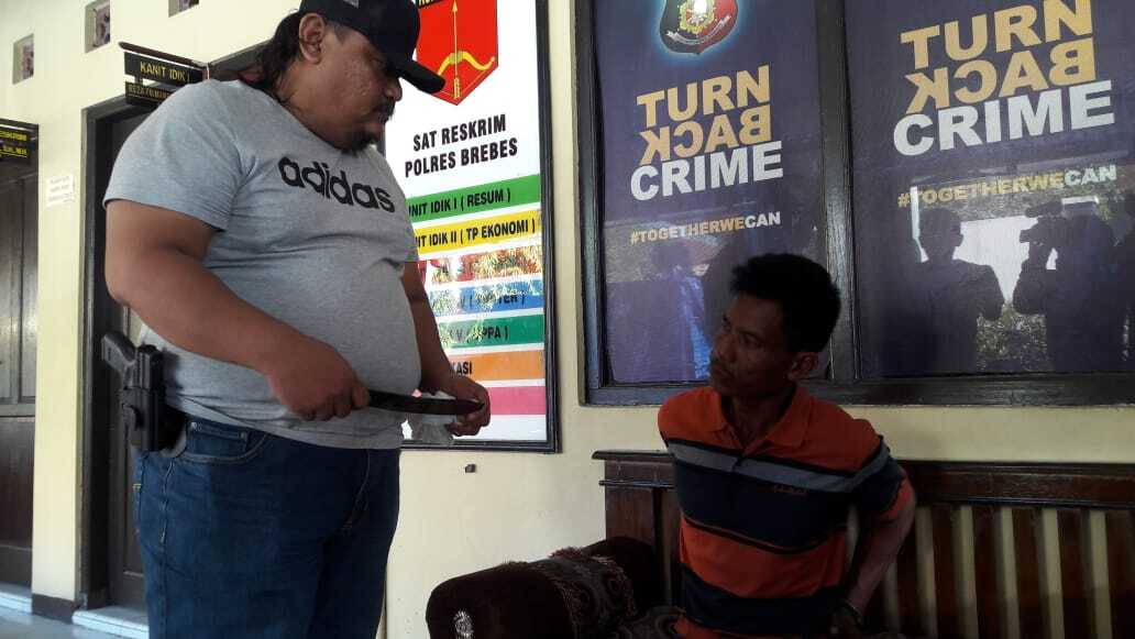 Pada saat digelandang ke Mapolres Brebes, Sabtu pagi (6/4/2019). Selain pelaku, polisi juga mengamankan 1 (satu) buah golok yang digunakan pelaku untuk membunuh korban.