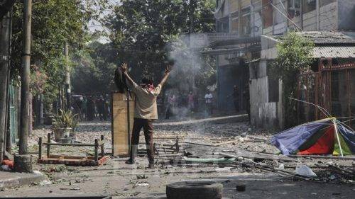 Massa juga terus melempari polisi dengan batu serta bom molotov. Mereka juga mengarahkan kembang api dan petasan ke blokade polisi.