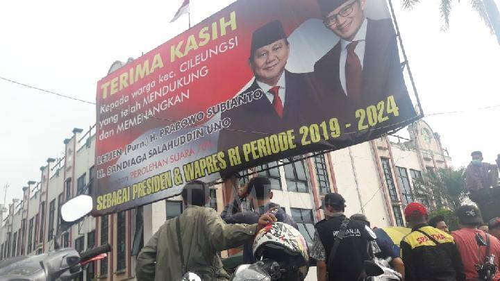 Sedangkan di beberapa lokasi, seperti di Jakarta, Bogor, Depok, Tangerang, dan Bekasi, terbentang baliho kemenangan Prabowo-Sandi.