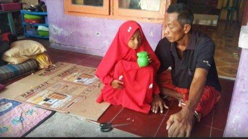 Nisda (8), nama anak yang mengalami nasib kurang beruntung itu setiap harinya hanya bisa menemani dan membantu bapaknya, Tarmuji (48) yang sudah tujuh tahun diuji sakit strok oleh Tuhan.