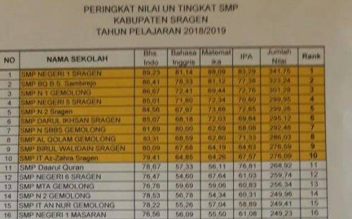 Nilai total itu merupakan akumulasi dari nilai rata-rata empat mata pelajaran yang diujikan di UN. Berdasarkan data hasil UN 2019 yang dilansir Dinas Pendidikan dan Kebudayaan Sragen, 10 besar peringkat teratas dibagi rata SMP negeri dan SMP swasta.