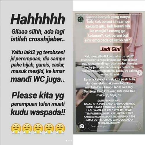 ‘Hahhhh Gilaaa siihh, ada lagi istilah crosshijaber..Yaitu laki2 yg terobsesi jd perempuan, dia sampe pake hijab, gamis, cadar, masuk mesjid ke kmar mandi WC juga..’