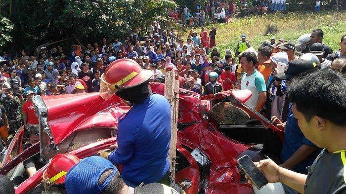 Bagian samping kiri mobil berwarna merah tersebut ringsek akibat benturan keras tersebut. Akibat kejadian itu dua penumpang dalam mobil tersebut diduga tewas seketika.