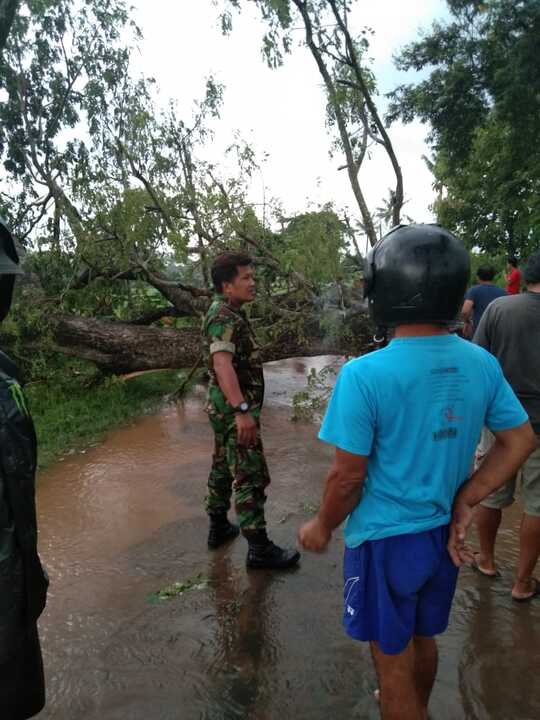 Sebuah pohon trembesi berukuran besar tumbang dan melintang jalan. Bukan itu saja sebuah tiang listrik ikut miring lantaran kabel tertarik pohon yang tumbang tersebut.