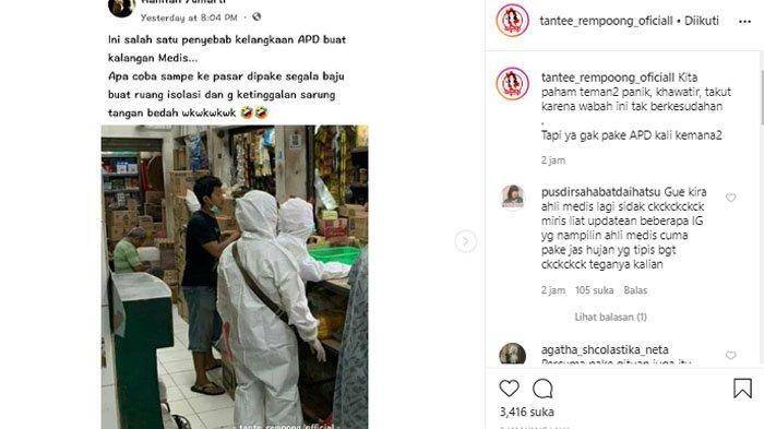 “Ini salah satu penyebab kelangkaan APD buat kalangan medis. Apa coba sampe ke pasar dipake segala baju buat ruang isolasi dan g ketinggalan sarung tangan bedah wkwkwkwkwk…,” tulis akun @Hanifah Yuniarti.