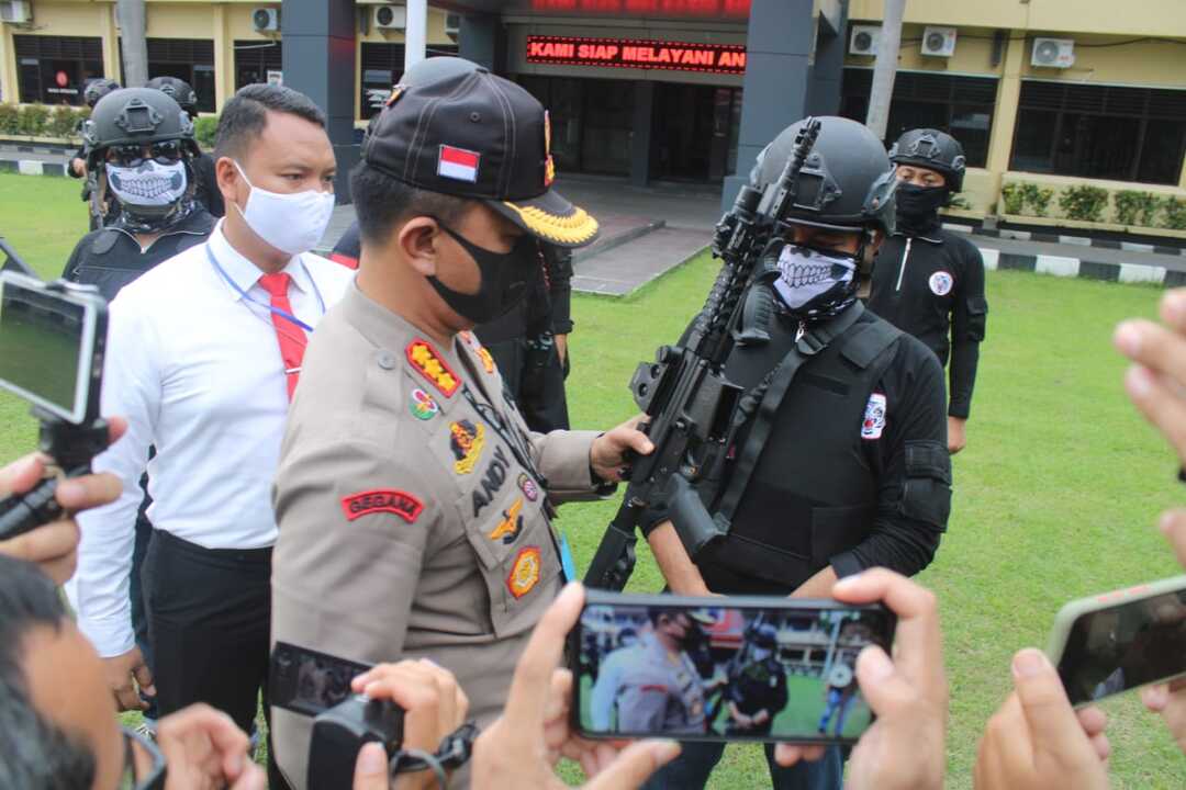 Kapolresta melakukan pengecakan langsung puluhan petugas bersenjata lengkap di halaman Mapolres, Senin (20/04/20). Andy memerintahkan tindakan tegas dan terukur kepada para pelaku kejahatan yang mengancam keselamatan masyarakat maupun petugas.