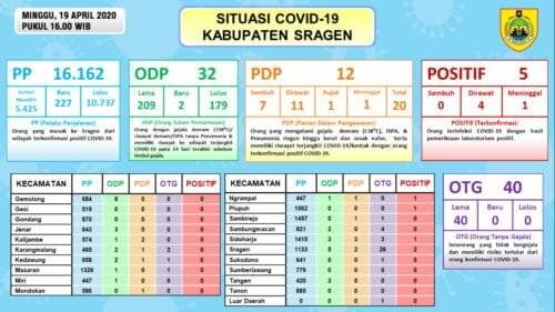 SRAGEN, JOGLOSEMARNEWS.COM – Situasi covid-19 di Sragen terbaru hingga Minggu (19/4/2020) malam masih menunjukkan tren peningkatan.