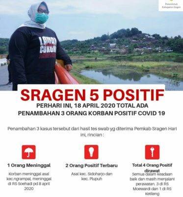 Berdasarkan data terbaru yang dilansir laman website resmi Pemkab Sragen di corona.sragenkab.go.id, hingga Minggu (19/4/2020) malam pukul 22.00 WIB, total ada lima kasus positif covid-19 di Sragen.