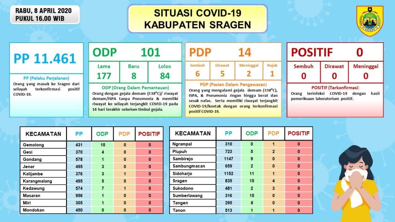 Berdasarkan data terbaru yang dilansir laman website resmi Pemkab Sragen di corona.sragenkab.go.id, hingga Rabu (8/4/2020) petang pukul 17.00 WIB, jumlah PP atau pemudik yang baru pulang dari wilayah terkonfirmasi covid-19 naik dari 9.538 orang sehari sebelumnya, menjadi 11.461 orang.