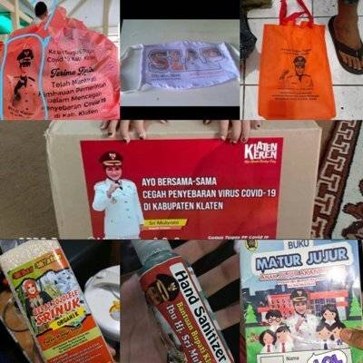 Sementara itu, Gubernur Jawa Tengah Ganjar Pranowo menegur Bupati Klaten Sri Mulyani terkait temuan adanya hand sanitizer yang dibagikan ke warga tertempel stiker berwajah Sri.