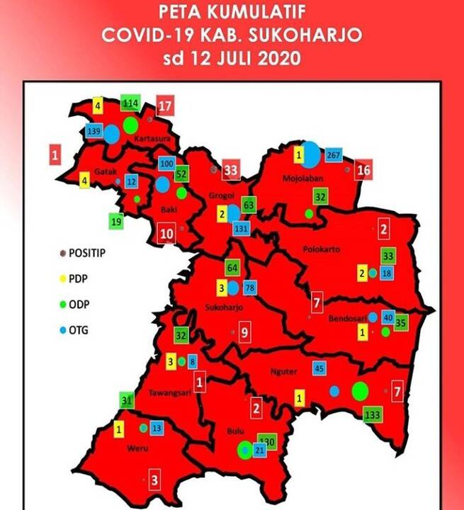 Informasi yang dihimpun dari akun resmi instagram Dinas Kesehatan Sukoharjo, Minggu (12/7/2020), total kasus terkonfirmasi positif COVID-19 sekarang adalah 108 buah. Menyusul penambahan kasus di sejumlah kecamatan termasuk Gatak dan Tawangsari. Dua kecamatan ini sebelumnya masih zero kasus.