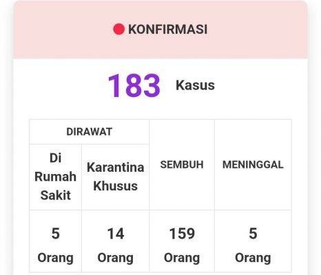 Data yang dihimpun dari Satgas Percepatan Penanganan COVID-19 Wonogiri, Selasa (25/8/2020), jumlah komulatif positif COVID-19 mencapai 183. Perinciannya sembuh 159 orang, isolasi mandiri 14 orang, dirawat di rumah sakit lima pasien dan lima orang meninggal.