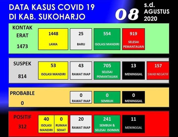 Informasi yang dihimpun dari akun resmi instagram Dinas Kesehatan Sukoharjo, Minggu (9/8/2020), kasus positif mencapai angka 312. Sebelumnya berada di angka 297.