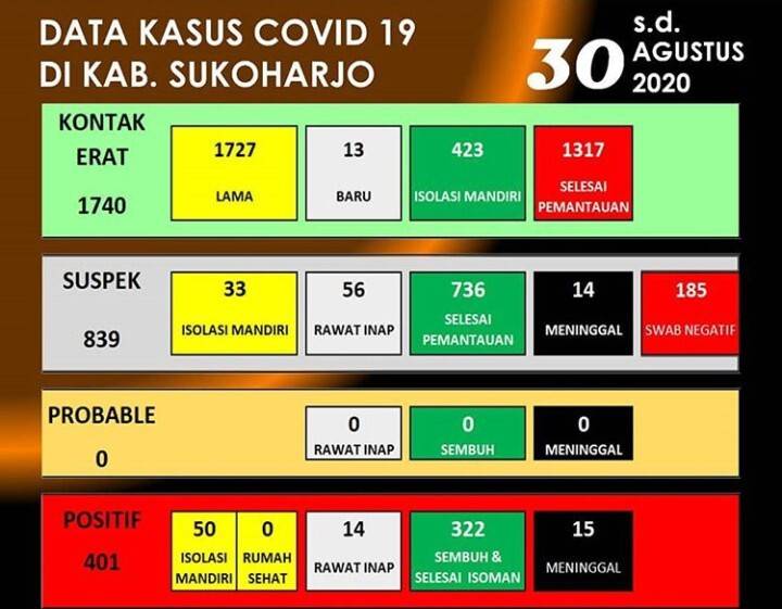 Informasi yang dihimpun dari akun resmi instagram Dinas Kesehatan Sukoharjo, Senin (31/8/2020), akumulasi kasus positif Corona di Sukoharjo di angka 401 kasus. Sedangkan kasus positif sembuh totalnya 322 kasus.