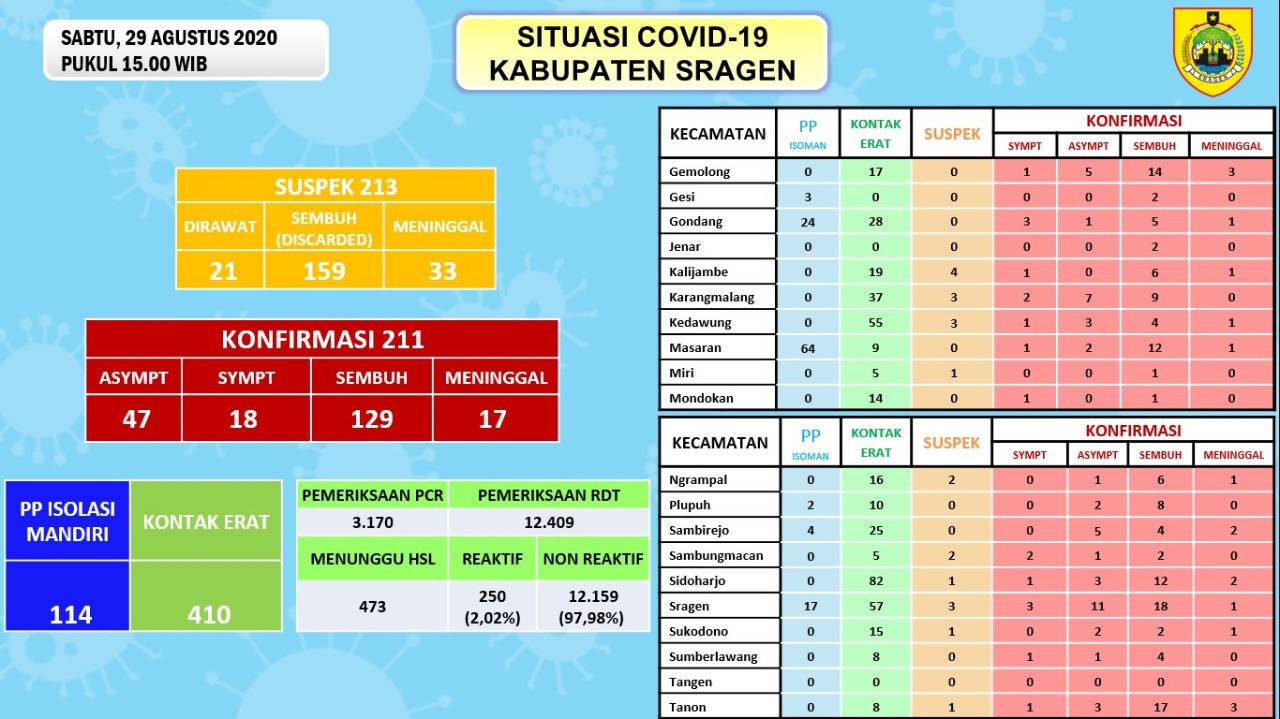 Dengan tambahan tiga kasus positif, maka hingga hari ini jumlah kasus positif covid-19 Sragen sudah mencapai 211 kasus. Dari jumlah itu, 65 orang dirawat dengan 47 asimptomatik dan 18 simptomatik, 129 sembuh dan 17 meninggal dunia.