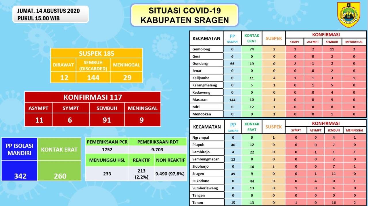 Kepala Dinas Kesehatan Kabupaten (DKK Sragen), Hargiyanto menambahkan dengan bertambahnya 4 konfirmasi positif, hingga hari ini jumlah kasus positif covid-19 di Sragen mencapai 117 kasus.