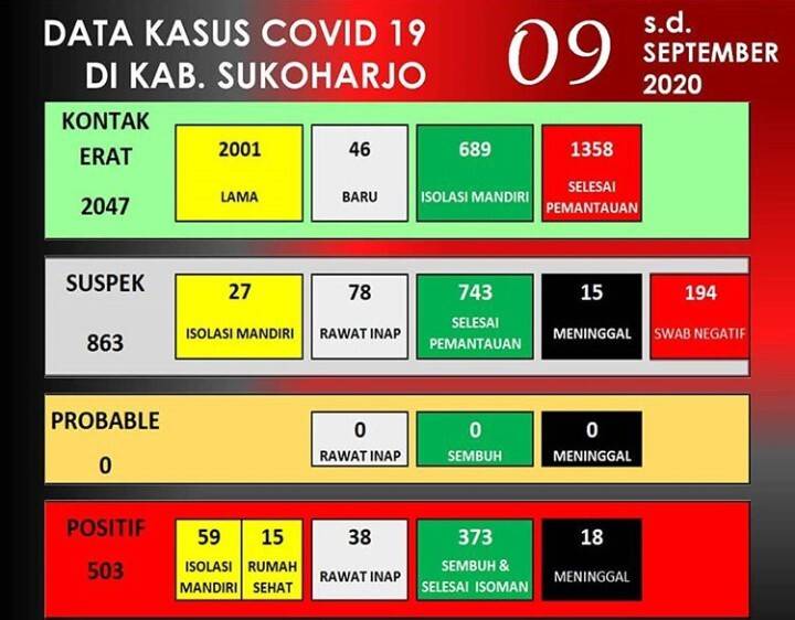 Data yang diperoleh dari akun resmi instagram Dinas Kesehatan Sukoharjo, Kamis (10/9/2020), terjadi penambahan kasus pasien meninggal. Di hari sebelumnya jumlahnya 17, saat ini bertambah satu menjadi 18 orang.