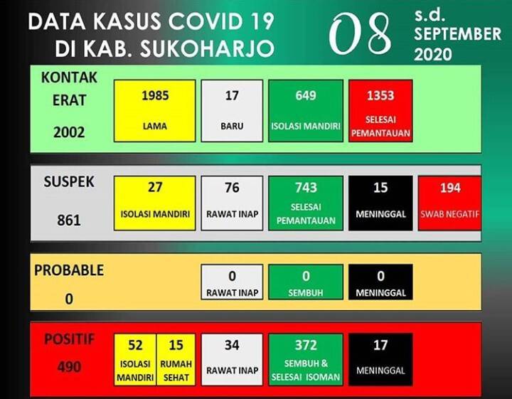 Informasi yang dihimpun dari akun resmi instagram Dinas Kesehatan Sukoharjo, Rabu (9/9/2020), secara akumulatif kasus positif COVID-19 mendekati angka 500. Tepatnya adalah 490.