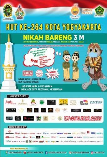 JOGJA- Menyemarakkan  momentum HUT Kota Jogja ke-264, Forum Ta’aruf Indonesia (Fortais) Sewon Bantul  bekerjasama  dengan KUA Kotagede Yogyakarta dan pemerintah Kota Yogyakarta akan menggelar event Nikah Bareng 3M. Tema ini diusung untuk terus memberikan kesadaran kepada masyarakat agar mematuhi protokol kesehatan di tengah pandemi Covid-19.