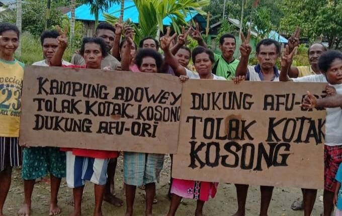 “Kami menolak kehadiran tim Kotak Kosong di kampung Aduwey, kami masyarakat semua mendukung pasangan Faris-Ori,” jelas Silas Hae.