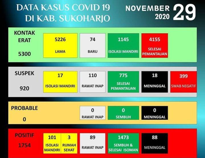 Informasi yang dihimpun dari akun resmi instagram Dinas Kesehatan Sukoharjo, Senin (30/11/2020), akumulasi kasus positif corona di Sukoharjo saat ini berada di angka 1.754. Dua hari sebelumnya masih di angka 1.711 kasus. Alias ada penambahan sebanyak 43 kasus baru.