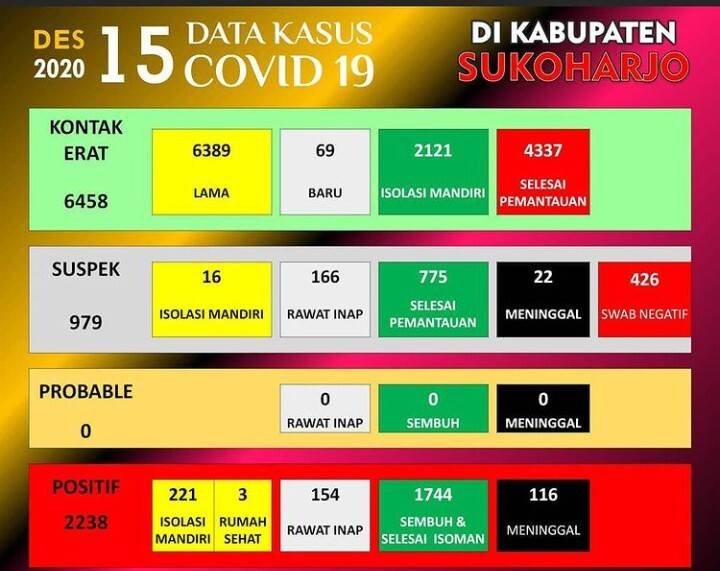 Informasi yang dihimpun dari akun resmi instagram Dinas Kesehatan Sukoharjo, Rabu (16/12/2020), akumulasi kasus positif corona di Sukoharjo saat ini berada di angka 2.238. Pada hari sebelumnya angkanya masih 2.210, atau terjadi lonjakan 28 kasus baru.