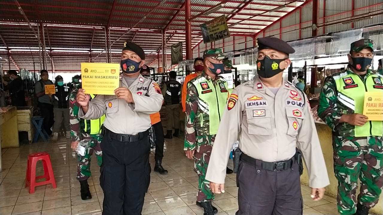 Dengan membawa pengeras suara sambil membawa poster imbauan protokol kesehatan dan membagikan masker gratis kepada pengunjung pasar yang belum memakai masker.