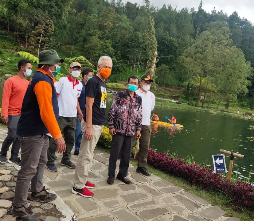 KARANGANYAR, JOGLOSEMARNEWS.COM -Kunjungi obyek wisata telaga Madirda di Desa Berjo, Ngargoyoso, Karanganyar, Sabtu (14/3/2021) Gubernur Jateng, Ganjar Pranowo tampak terpesona.