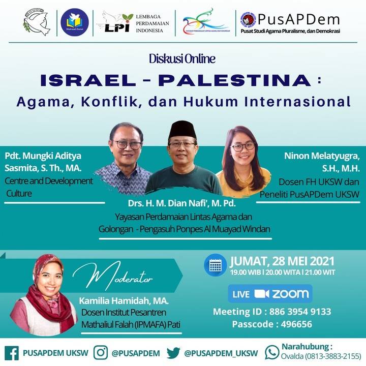 SALATIGA, JOGLOSEMARNEWS.COM – pusat studi agama pluralisme dan demokrasi Universitas Kristen Satya Wacana (UKSW) Salatiga menggelar diskusi secara online Israel-Palestina: Agama, Konflik dan Hukum Internasional, Jumat (28/5/2021).