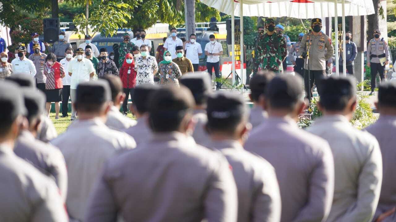 Kapolda menyampaikan amanatnya bahwa apel ini bertujuan untuk menyosialisasikan, mengantisipasi dan memutus mata rantai penyebaran virus corona.