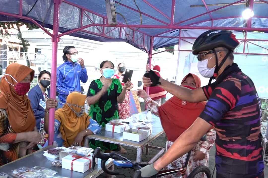 Saat gowes kali ini Ganjar memborong makanan dari PKL dan dibagikan kepada masyarakat di sekitarnya.