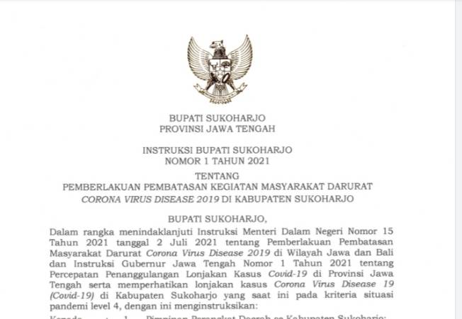 Bupati Sukoharjo Etik Suryani telah mengeluarkan Instruksi Bupati Nomor 1 Tahun 2021 tentang Pemberlakuan PPKM Darurat COVID-19 di Kabupaten Sukoharjo. Ada beberapa poin yang tercantum di dalamnya.