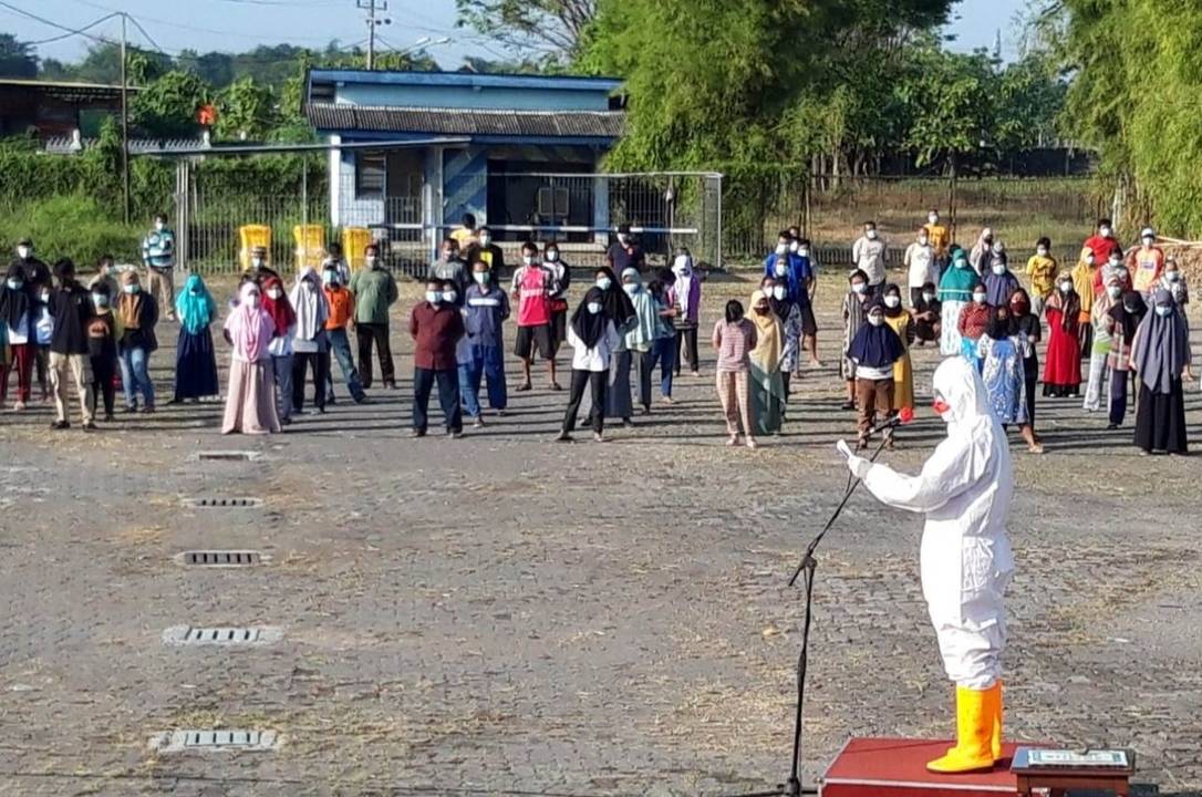 Upacara bendera dilaksanakan di halaman timur gedung Mekah Asrama Haji Donohudan, yang kini jadi tempat isolasi terpadu bagi pasien Covid-19.