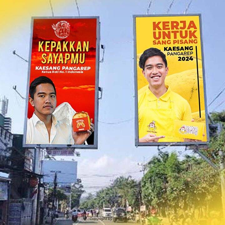 Tak berhenti di situ saja, baliho kanan terpampang nyata dengan warna kuning layaknya baliho ala Airlangga Hartarto. Bagaikan parodi, Kaesang menulis “Kerja untuk Sang Pisang Kaesang Pangarep 2024.” Produk yang dipromosikannya adalah Sang Pisang.