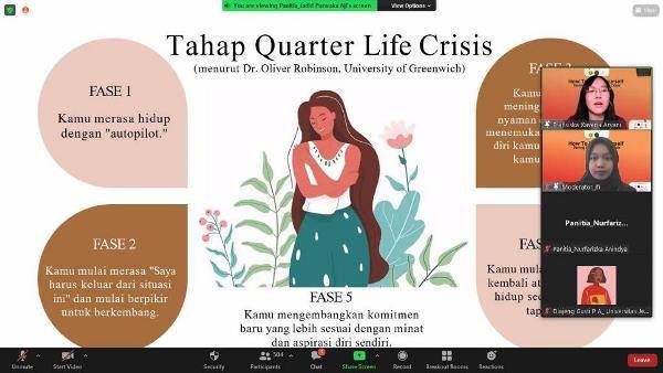 Kegiatan bertajuk “How To Love Yourself During Quarter Life Crisis” digelar secara online, Sabtu (07/08/2021). Hadir sebagai narasumber Fransiska Xaveria, M.Psi., Psikolog Klinis Biro Psikologi Indonesia Psylution dan Maria Angelica, mahasiswi berprestasi Fakultas Kedokteran Hewan Universitas Gadjah Mada (FKH UGM).
