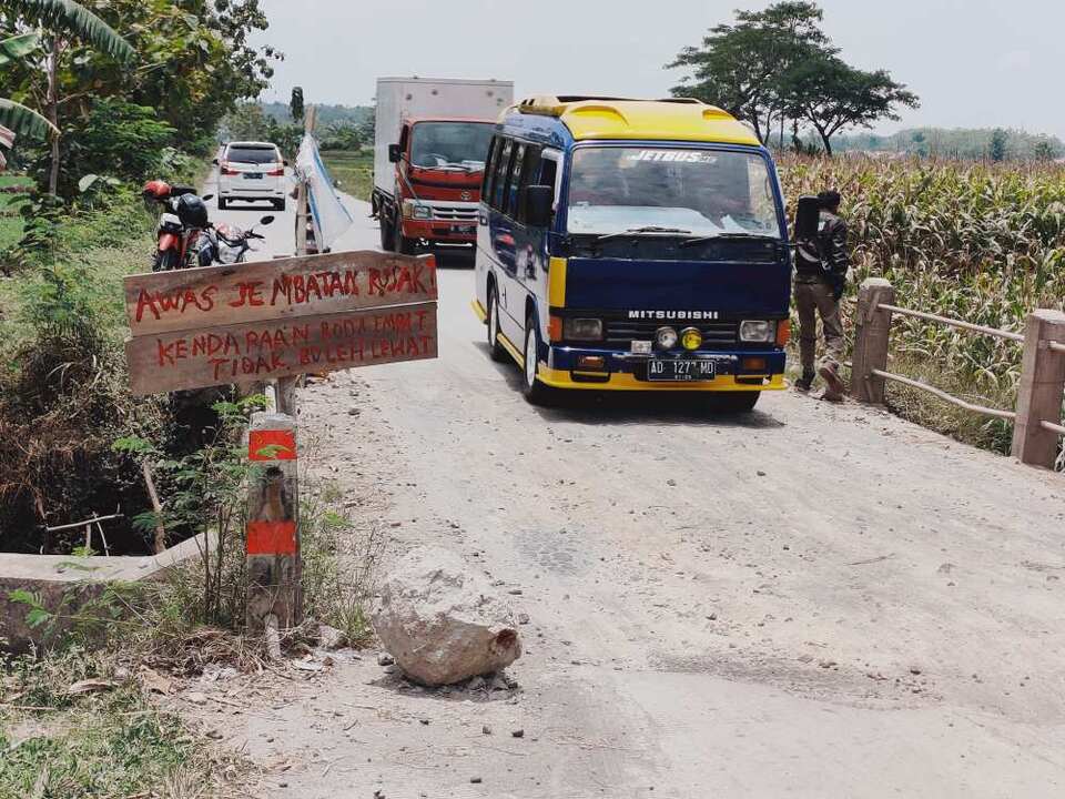 “Jenengan bisa lihat sendiri. Kondisi cor-corannya sudah retak, patah dan konstruksinya sangat tidak layak serta membahayakan. Padahal itu akses utama antar kabupaten. Kalau itu sampai putus total, warga makin susah karena harus muter 2 kilometer lewat jalan kampung yang jalannya juga sudah rusak parah,” tandasnya.