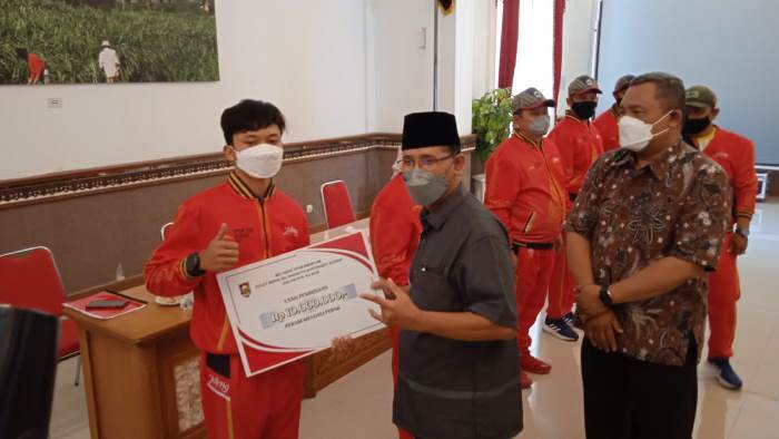 BOYOLALI, JOGLOSEMARNEWS.COM – Enam atlet PON asal Boyolali mendapatkan bonus dari Bupati Boyolali, M Said Hidayat. Penyerahan bonus dilakukan di Ruang Merbabu, Kantor Bupati, Jumat (5/11/2021).